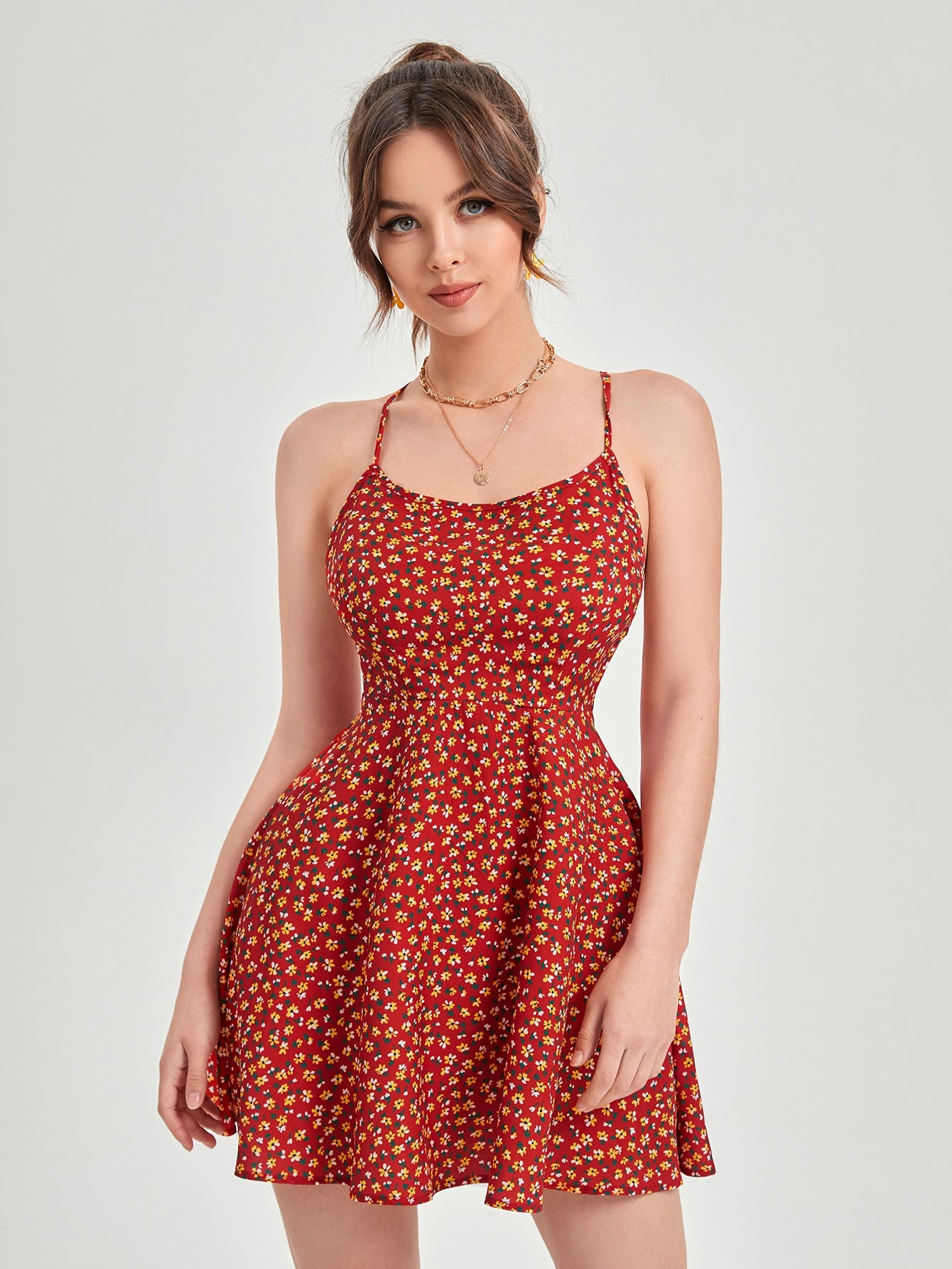 MOCHA LACE UP BACKLESS DITSY FLORAL CAMI DRESS